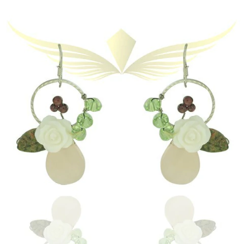 Brinco artesanal de acrílico em formato de rosa com folhinha e uma gota rosa pendurada.