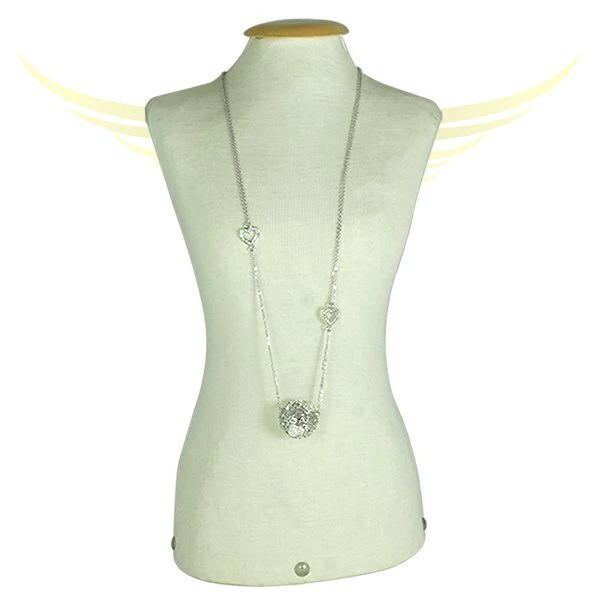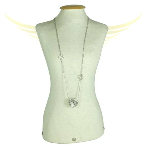 Colar de corrente dupla com dois corações vazados de strass cristal e com pingente em formato de bola vazada de vários corações com strass cristal.