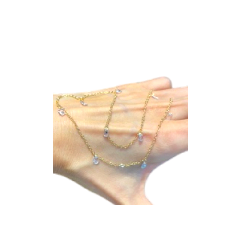 Colar feminino delicado com 10 pingentes de zircônia em formato de gotinha (0,3 x 0,5 cm, cor cristal) pendurados ao longo da corrente.