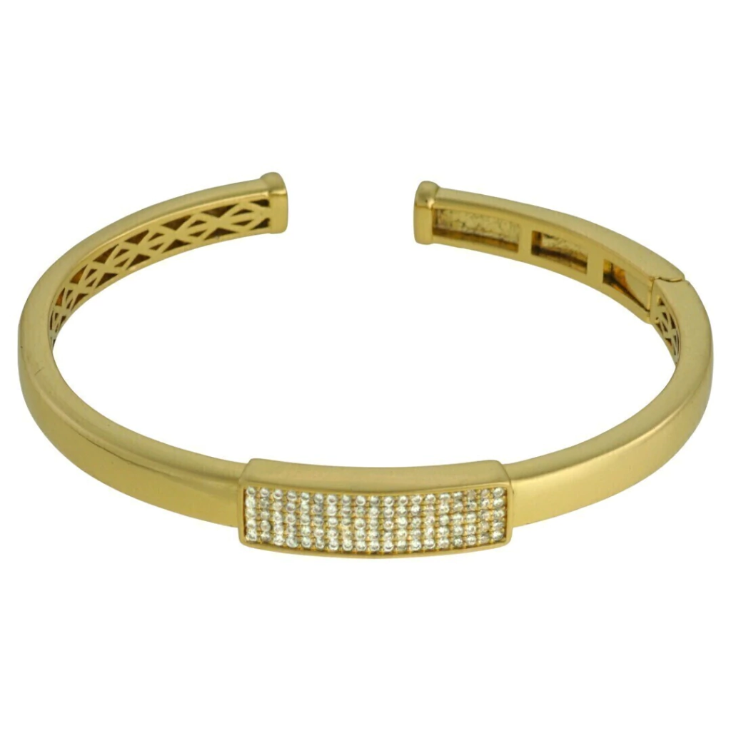 Bracelete moderno e elegante com detalhe retangular central cravejado de micro zircônias cristalinas.